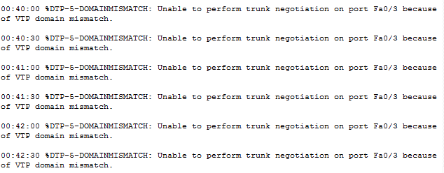 VTP domain is the domain name given to the switches while configuring the VTP on Cisco switches. For the proper trunk connection between two switches, the VTP domain should match otherwise trunk connection will fail and we will see the following error on the switch.