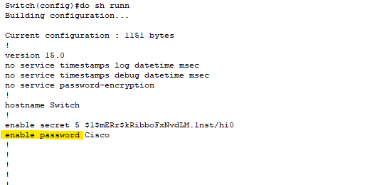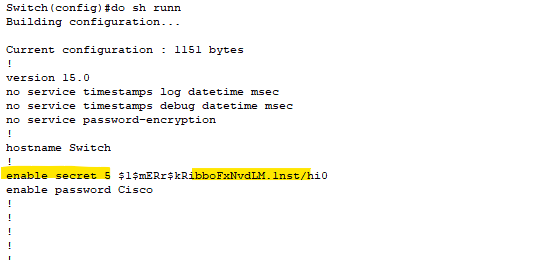 On the other hand, enable secret encrypts the configured password by using MD5 hashing so only an authorized person who knows the password can use the Cisco device. If someone tries to check the configured password in the running or startup config then they will see the hash value instead of the password.