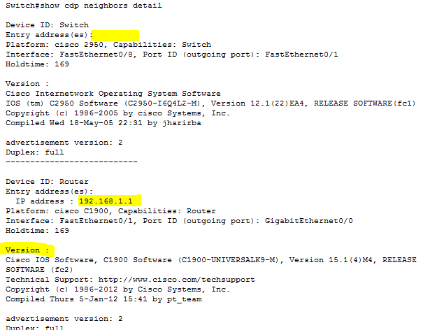 We can see in the image that apart from the information available from the ‘show CDP neighbor’ command, it gives the IP address of the connected device and shows the version of the IOS installed on the remote device. It also gives information about the duplex mode.